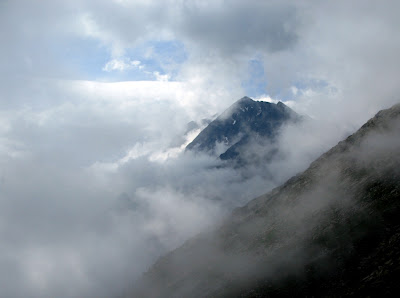 Toisin kuin K:n mielestä, on minusta ihan kiehtovaa seurata pilvien liikehdintää. K. haluaisi ehkä mieluiten täysin kirkkaan ja esteettömän panoraaman. Tällaista pilvien kulkemista ei näe kotimaassa. Maisema on kuin kuva-arvoitus. Yhtenä hetkenä näkyy alhaalla vilaus turkoosia vettä, ja muun maiseman peittää pilvet. Minuutin päästä pilvet ovat peittäneet järven ja nyt näkyykin taivaanrajassa huiman korkeat huiput.